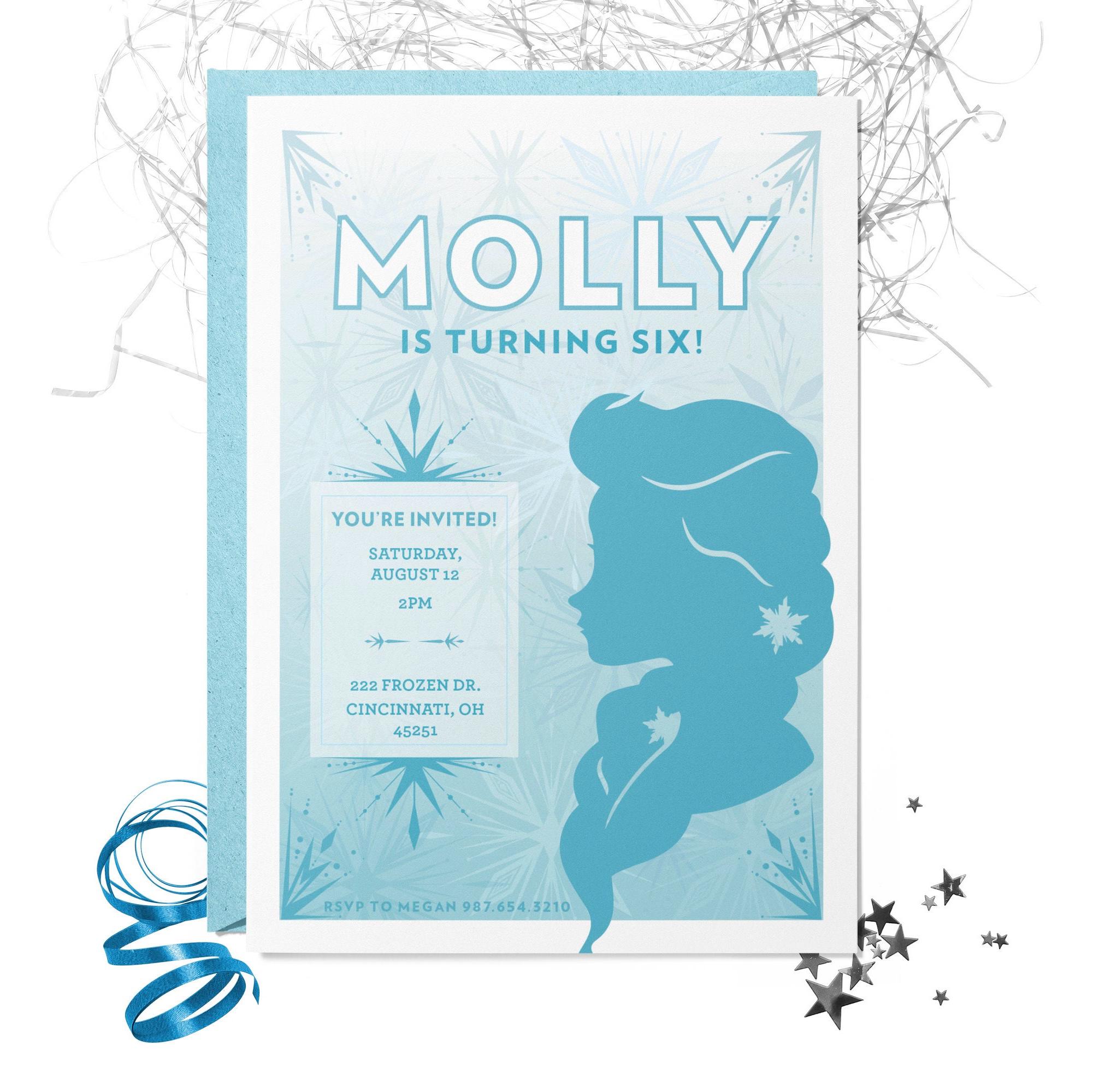 Celebrate in magical style with this Frozen-inspired birthday invitation — an enchanting Elsa design perfect for fans of the icy queen.