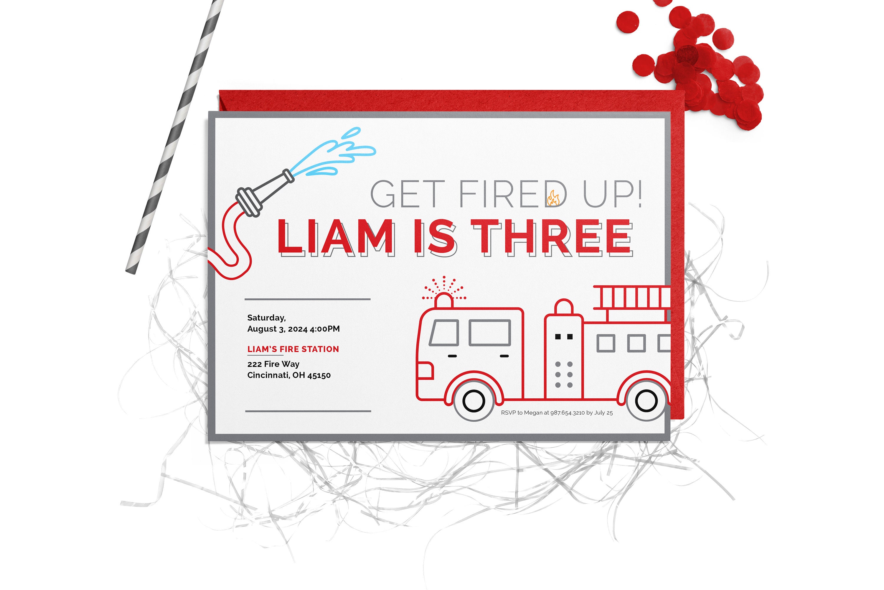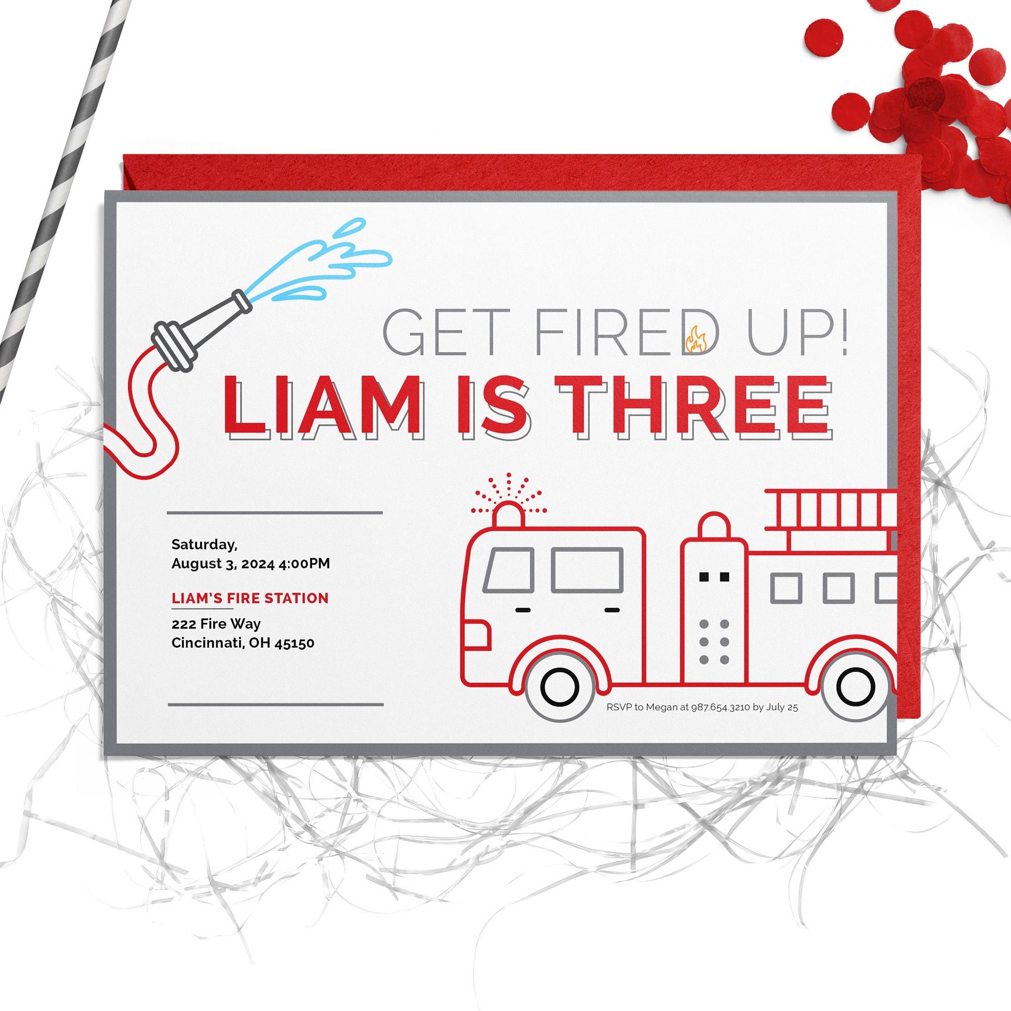 Sound the alarm with this Firetruck birthday invitation — a bold design made for kids who love trucks and rescue adventures.