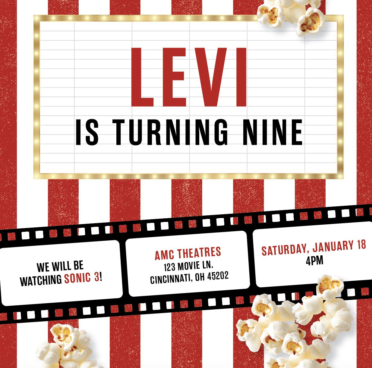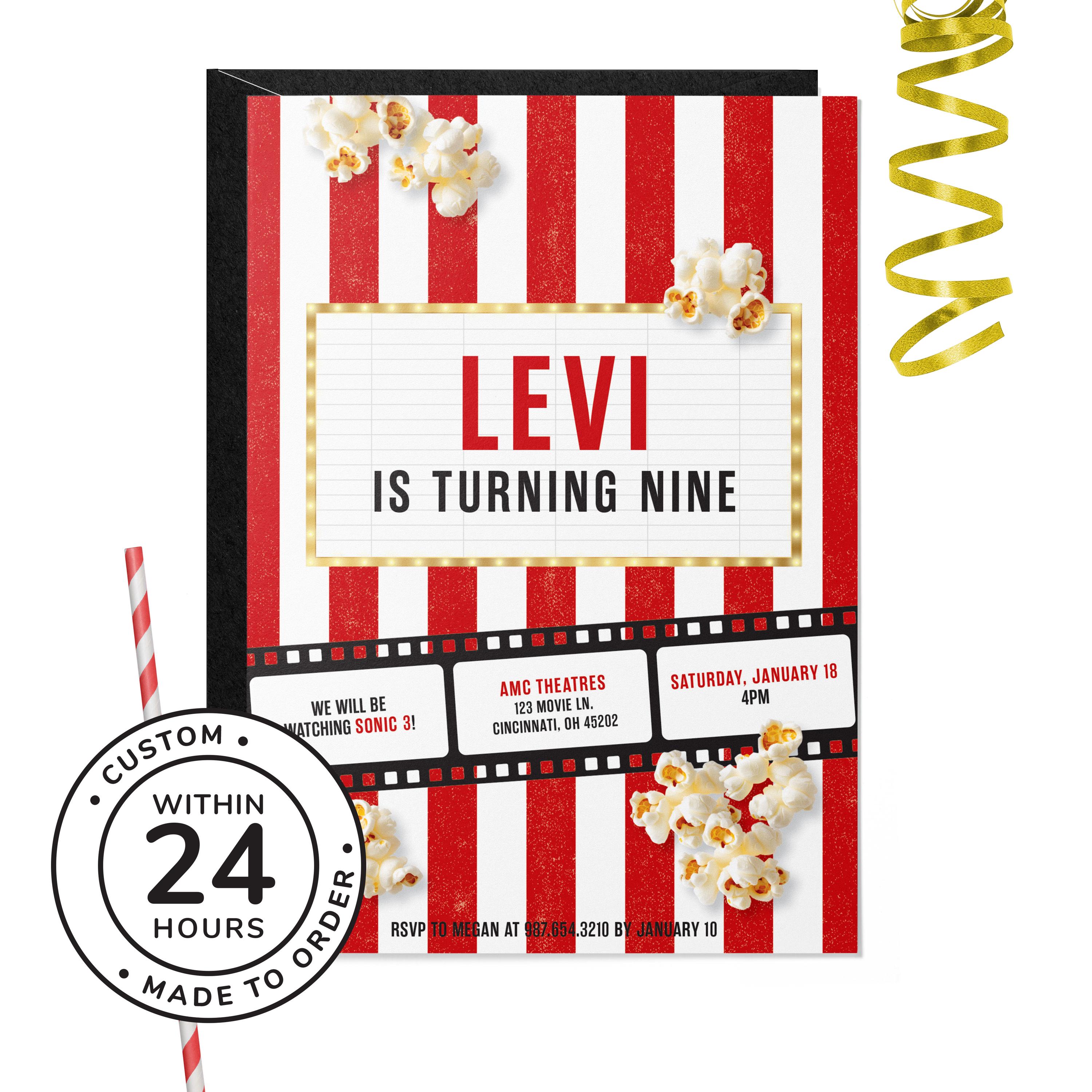 Roll out the red carpet with this Movie birthday invitation — a bold red-and-white striped design perfect for cinema or movie night parties.