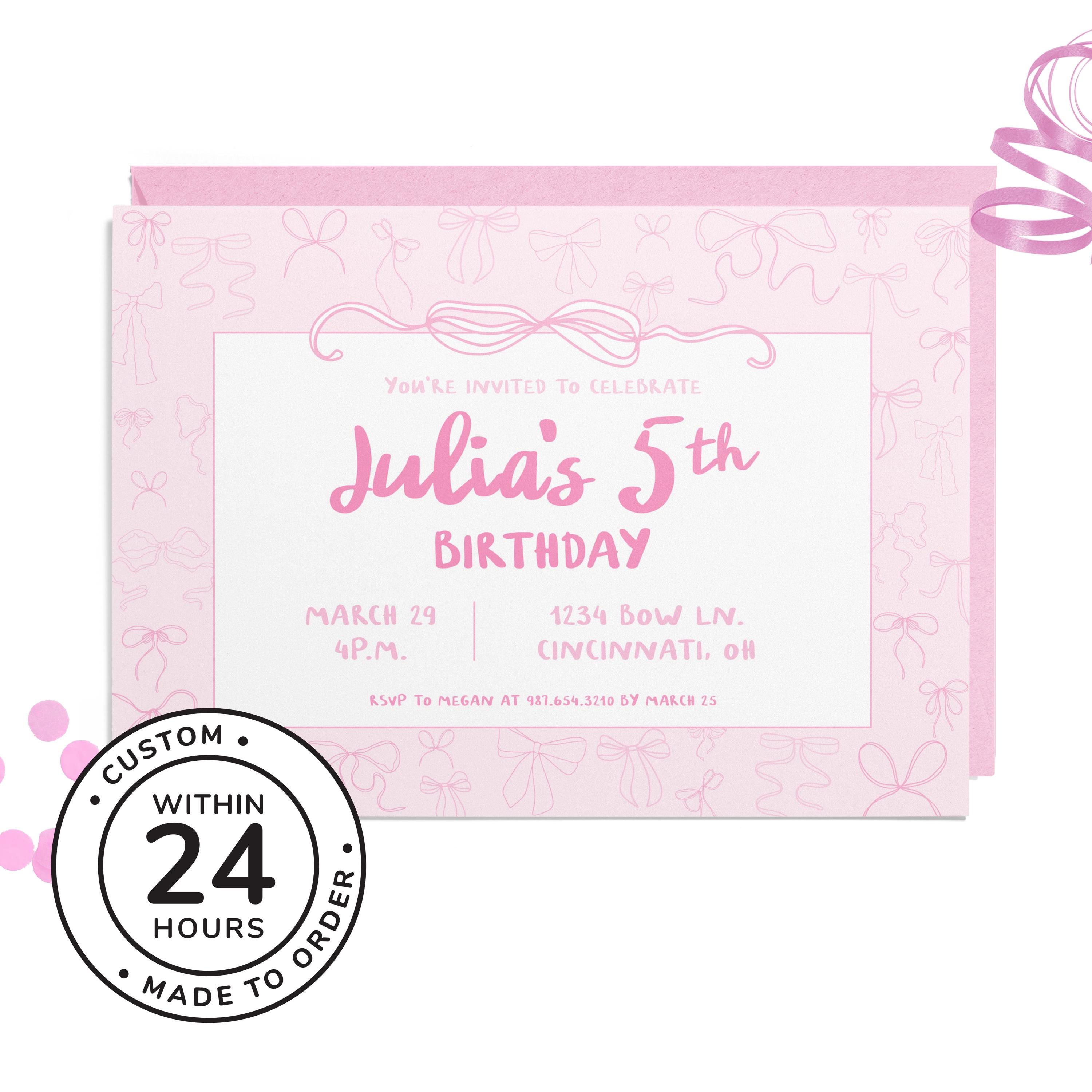Celebrate in sweet style with this Bow birthday invitation — a charming light pink design perfect for kids’ parties.