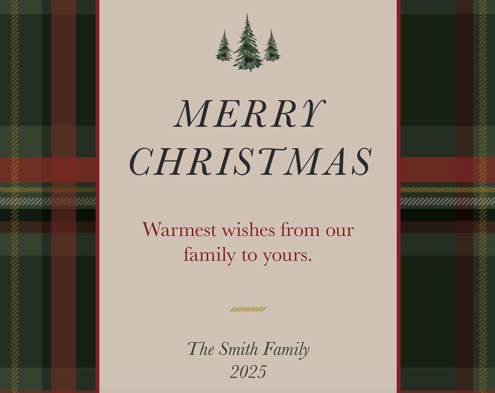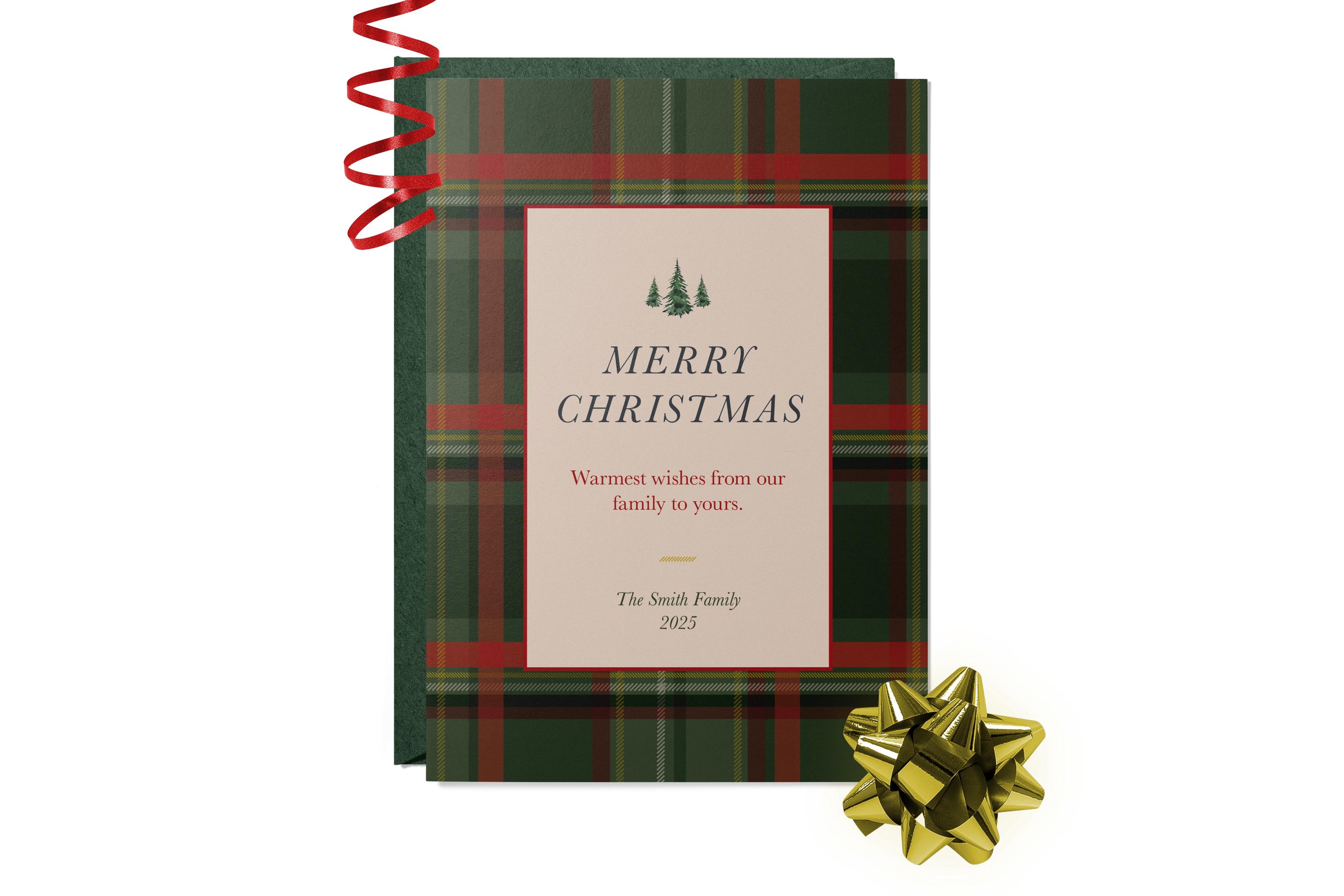 A cozy, classic Christmas card for the season. This warm plaid design features deep red and green traditional plaid a soft neutral background, and a painted evergreen tree motif. A perfect way to send heartfelt holiday wishes to family, friends or clients.