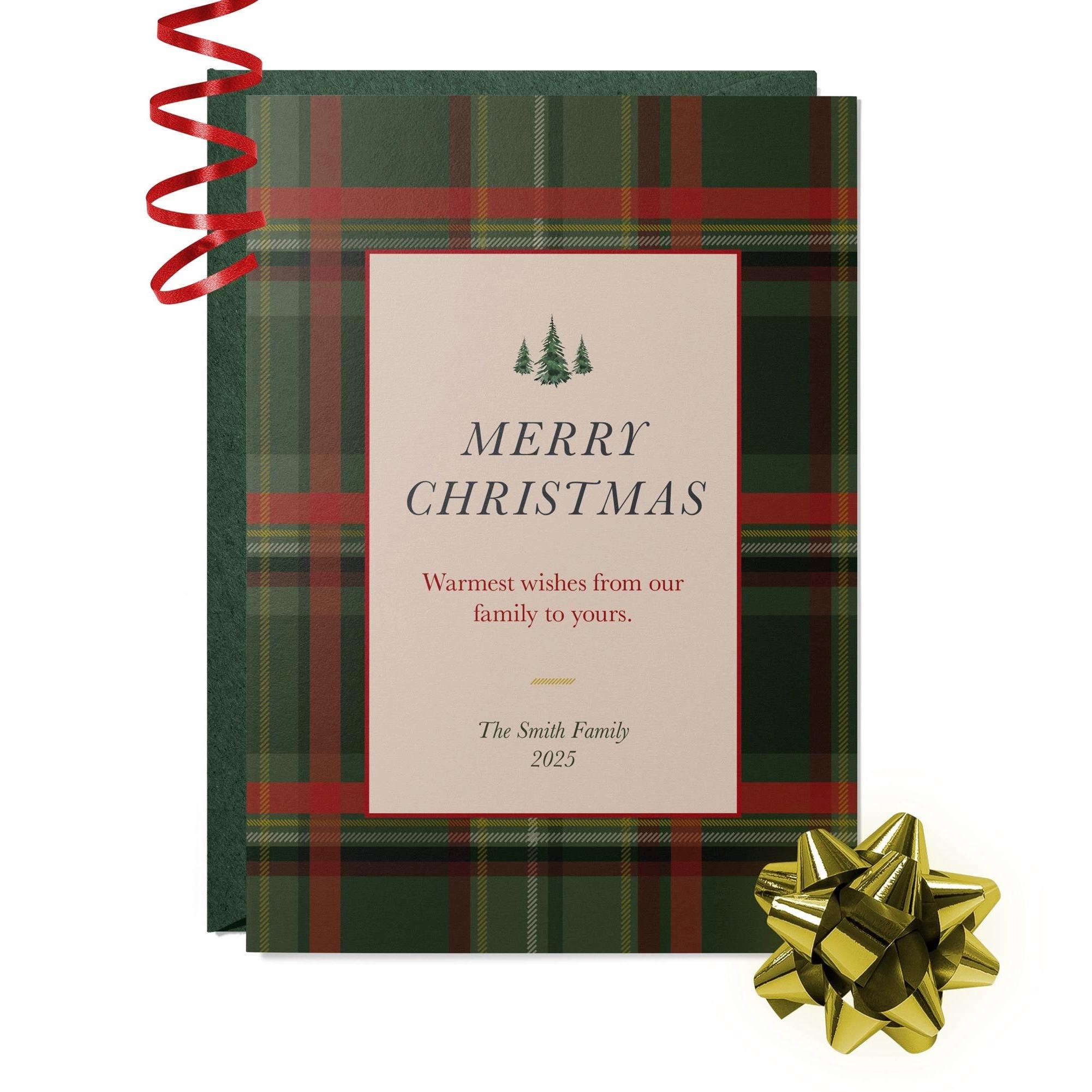 A cozy, classic Christmas card for the season. This warm plaid design features deep red and green traditional plaid a soft neutral background, and a painted evergreen tree motif. A perfect way to send heartfelt holiday wishes to family, friends or clients.