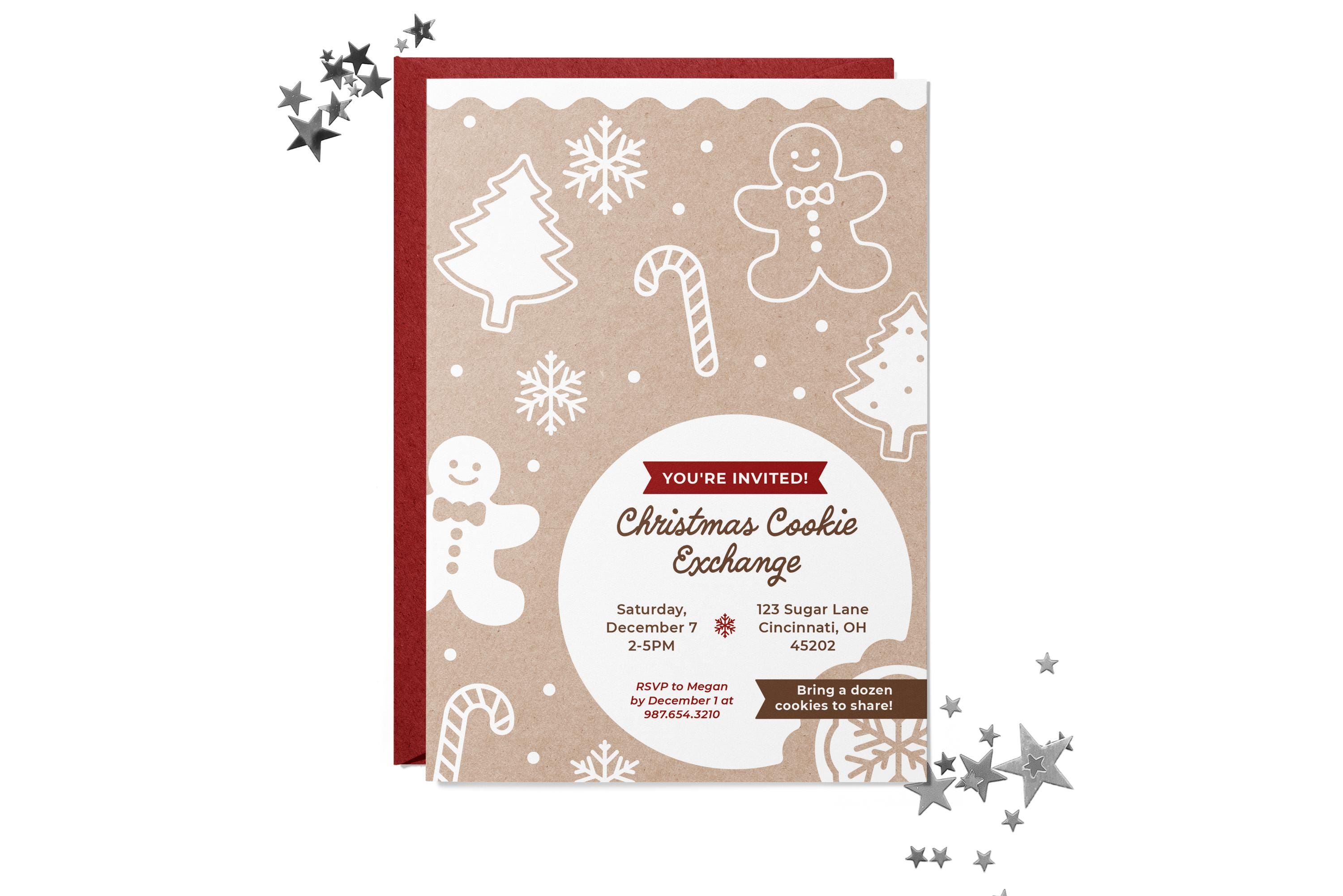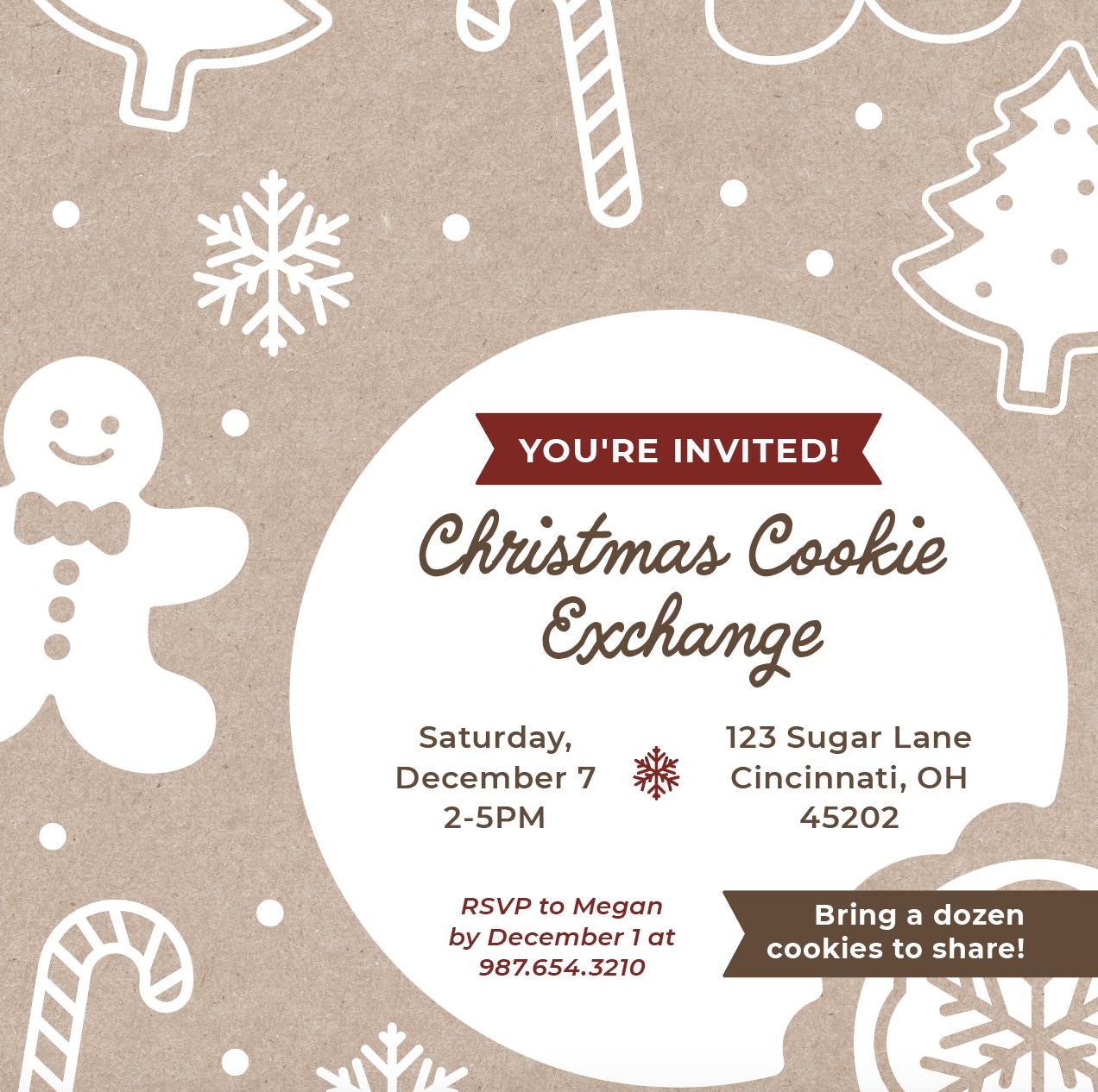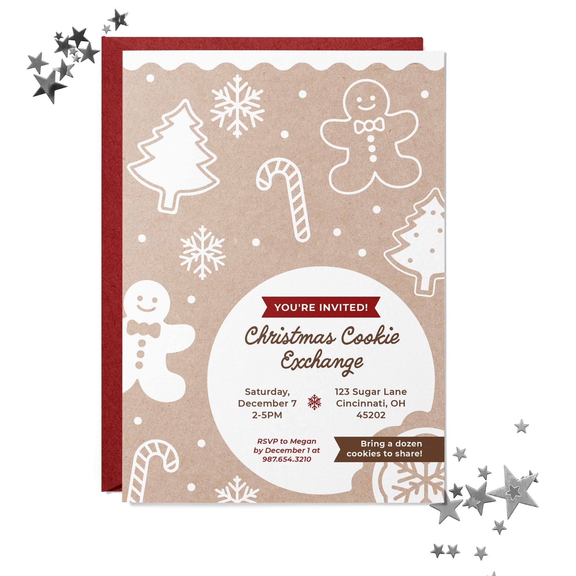 Warm, festive, and made just for you! This personalized Christmas Cookie Exchange invitation features a cozy Kraft paper background with white cookie-cutout illustrations and festive red accents–perfect for your holiday baking or cookie swap party.