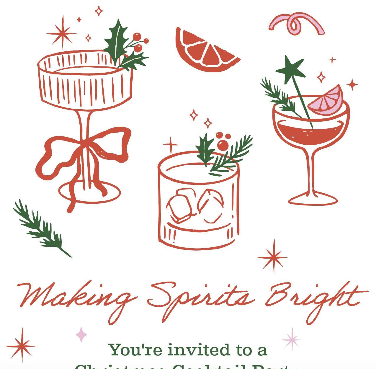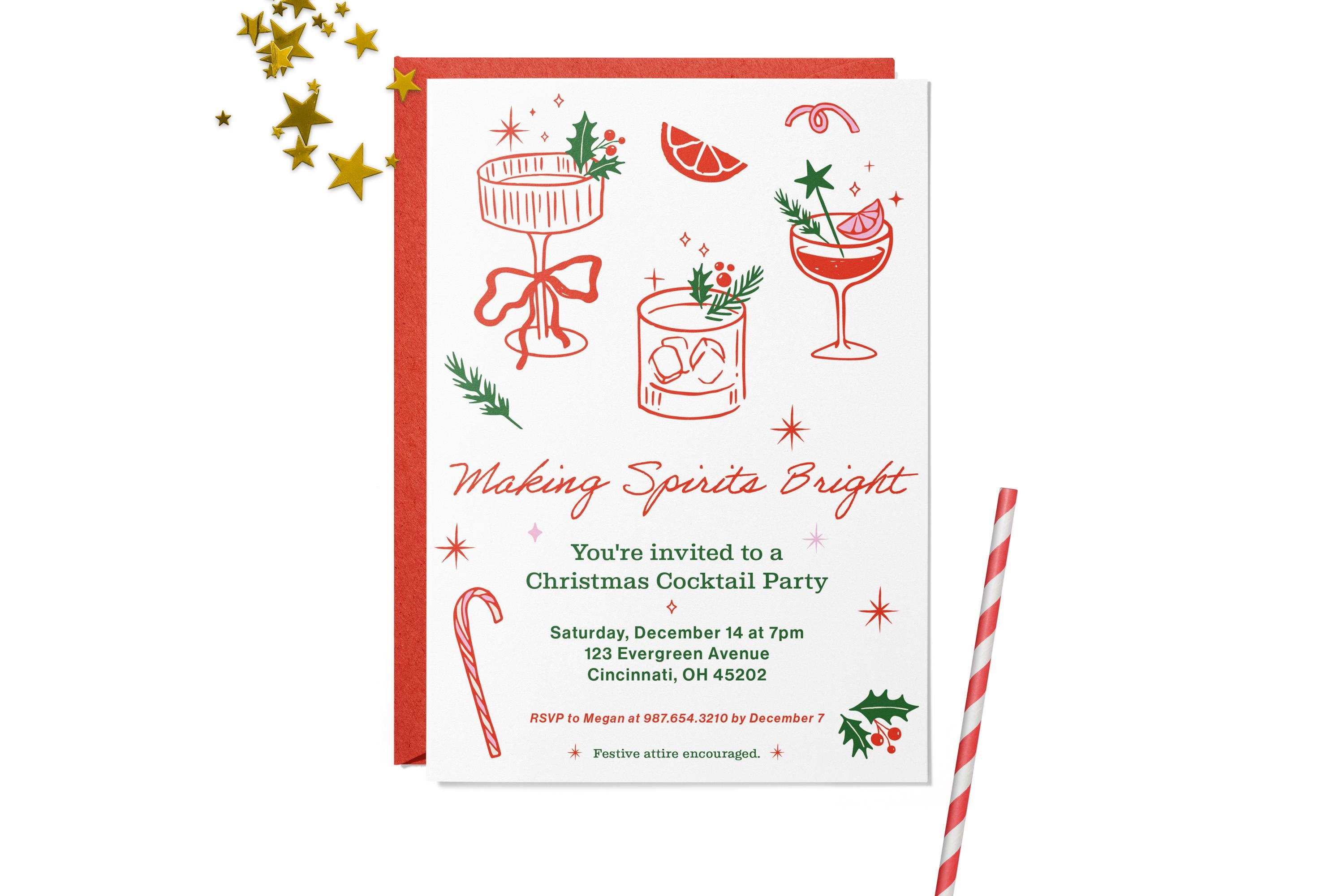 Cheers to the holiday season! This personalized Christmas Cocktail Party invitation features hand-drawn illustrations in fun holiday colors. Perfect for holiday gatherings or festive celebrations.