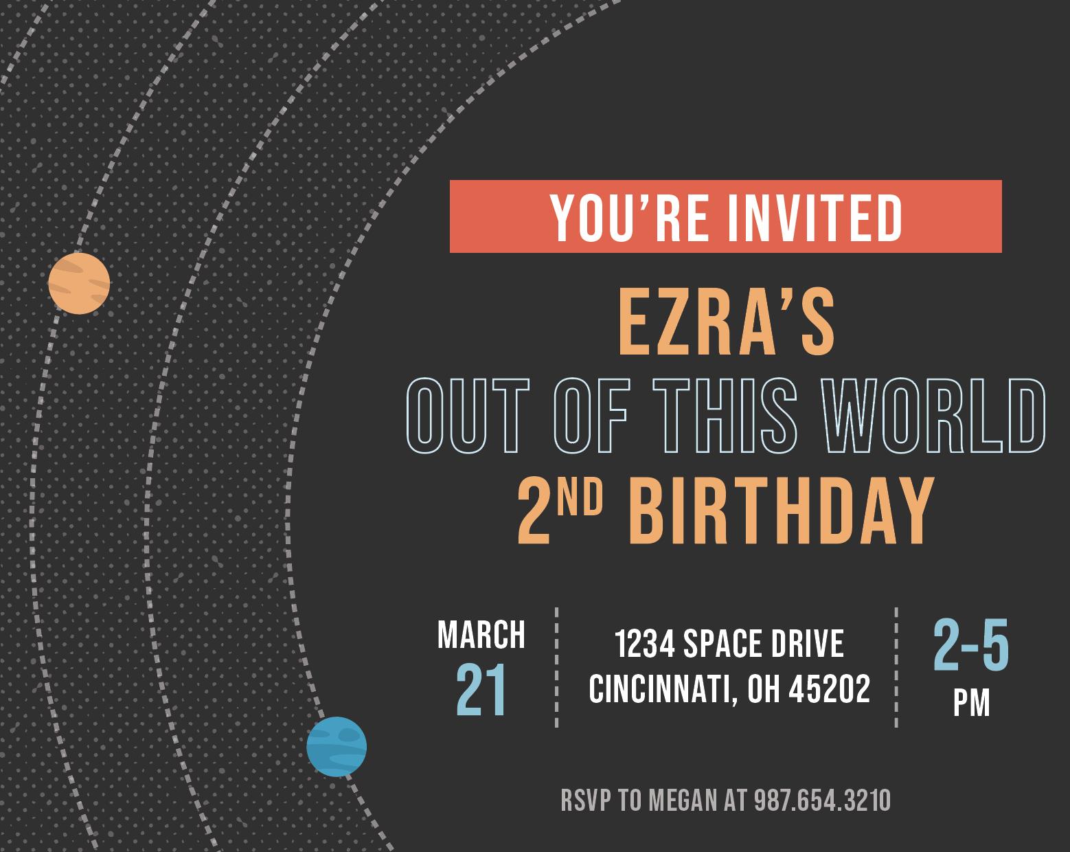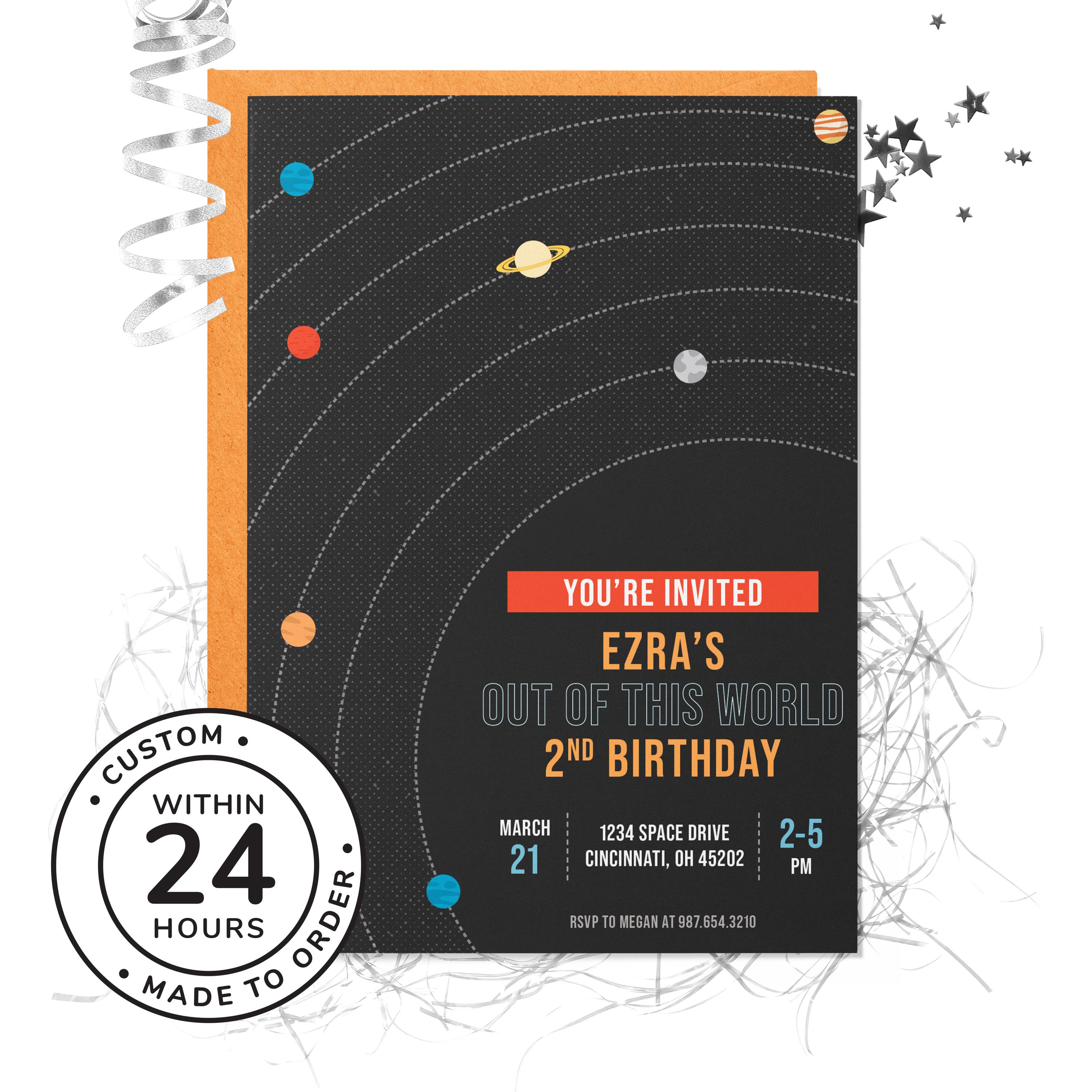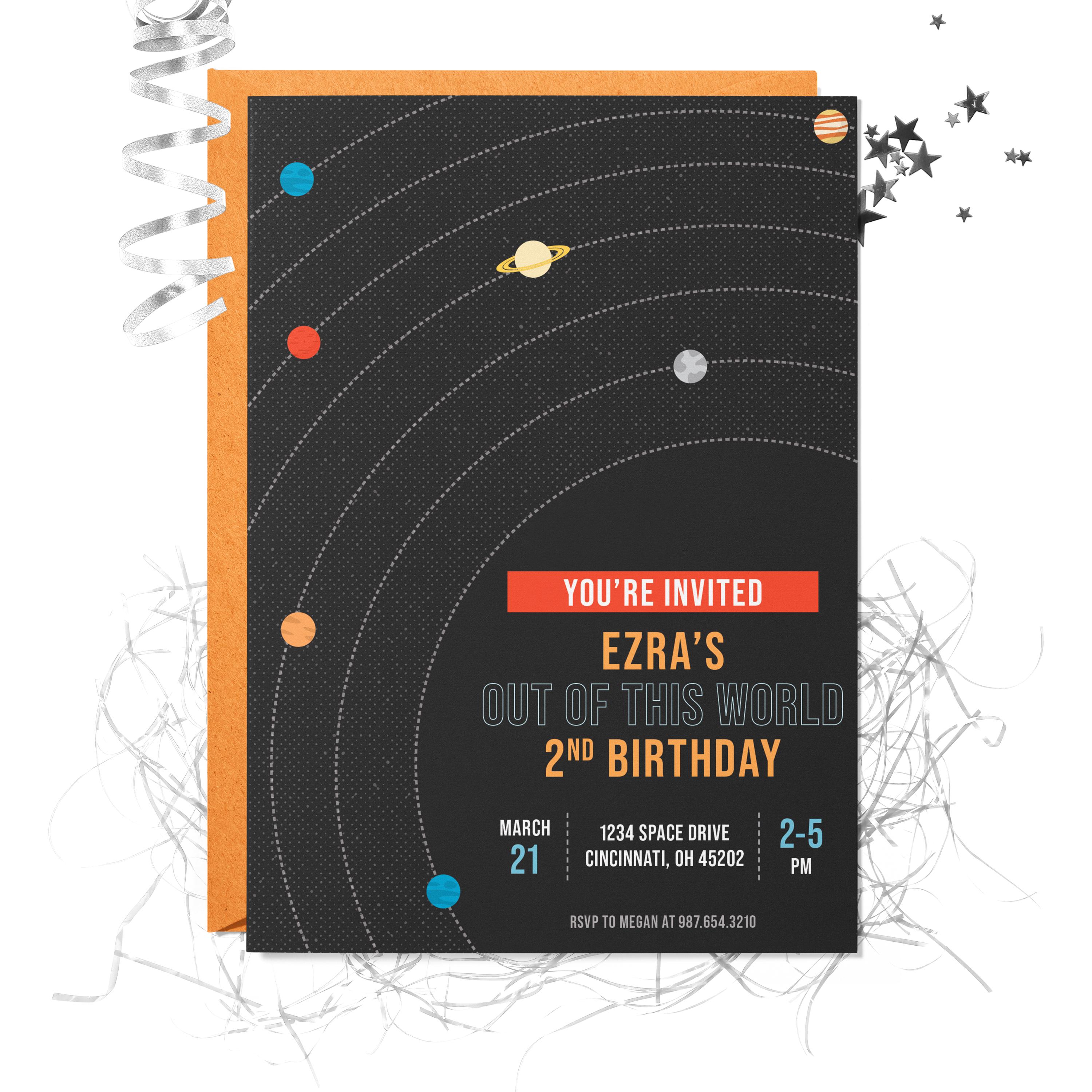 A modern spaced-themed birthday invitation featuring a playful solar system orbit design.